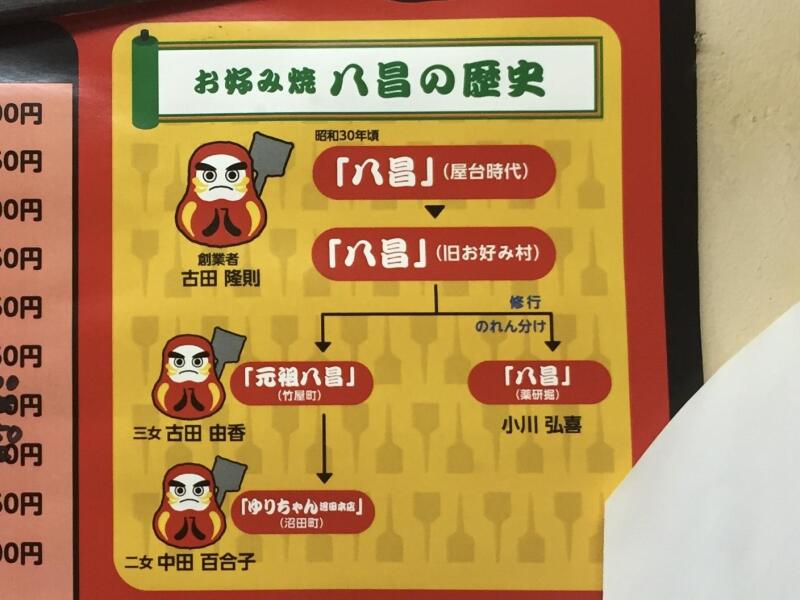 その後、「ちいちゃん」は正三郎さんの次男が後を継がれ、現在もお元気で店を切り盛りしている。「八昌」はお好み村を出て竹屋町に新しい店舗を構え「元祖八昌」を名乗る。隆則さんが亡くなると、三女由香さんが暖簾を継ぎ営業を続けている。その他に隆則さんの次女の沼田町「ゆりちゃん」、新天地「村長の店」、お好み村「たけのこ」、猿猴橋「紀乃国屋ぶんちゃん 惑星216」は全て古田一族の店になる。