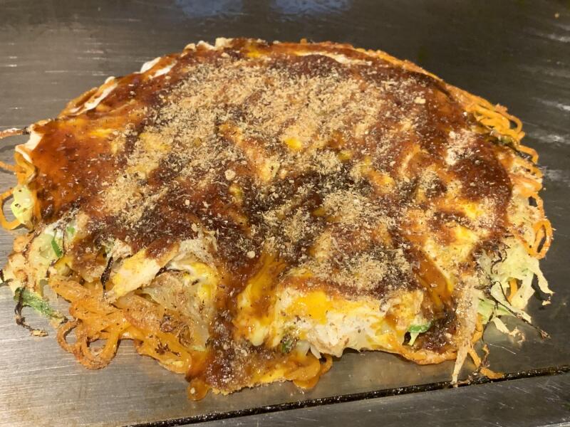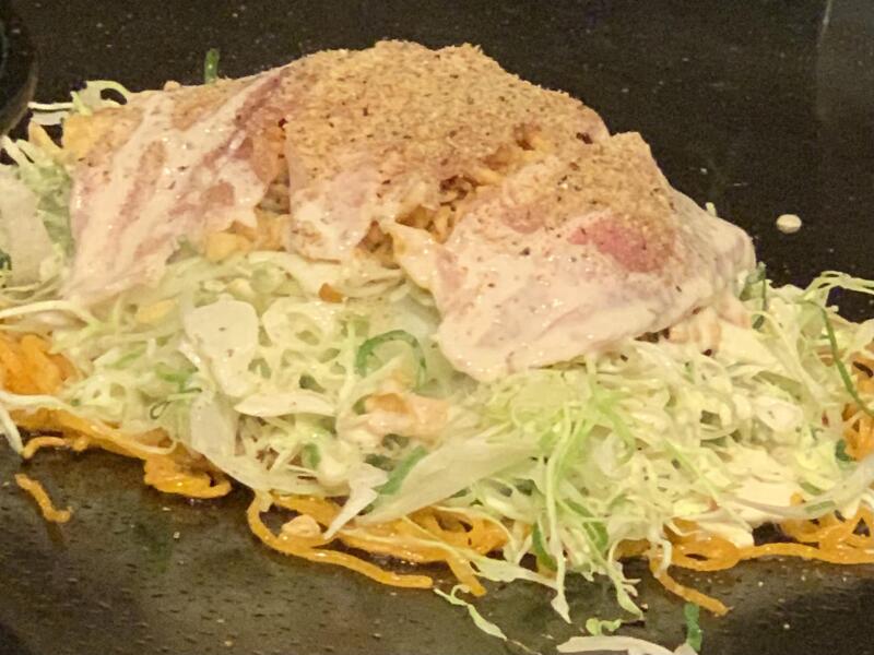 店主は流れるようにお好み焼を焼き始める。まず麺を処理し、その上にキャベツを乗せた。何が始まったのだろうと見ていると、そのまま天かす、豚肉と重ねて、最後に生地を上からたらした。こんな焼き方は初めて。びっくりして、他の客が注文したノーマルな肉玉そばを見ても同じ焼き方。