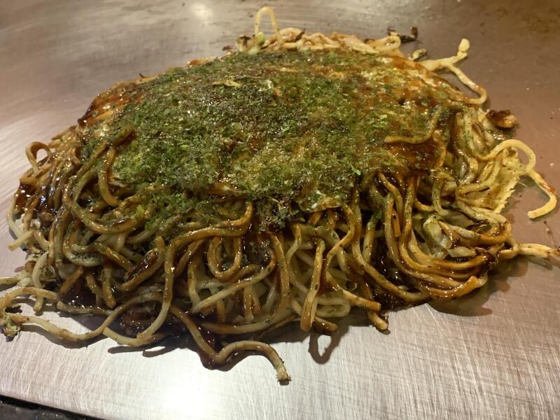 さて、お好み焼も注文。イカ天は食べたので、シンプルに肉玉そば。粘り気の強い生地に、大きめに刻まれたキャベツ。そして使用する麺は、浅草開花楼の特注麺。広島の薬研堀八昌で学んでからも試行錯誤を続けて、独自のお好み焼へと変化させているとのこと。ちなみに、昔はいその製麺を使用していた。
