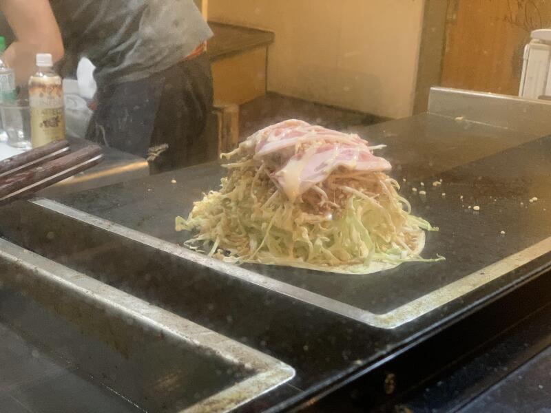 そんな様子を確認して、まずはビールと牛すじポン酢を注文。店主はちゃちゃっと手際よく用意して出してくれた。愛想も良い。じっくりと飲めそうだ。追加で鉄板焼きメニューを注文して少し店主と会話する。話によると、広島出身というわけでなく、鉄板料理に可能性を見出して、経堂八昌で修行したとのこと。ふむふむ、なるほど。そろそろお好み焼もお願いします。肉玉そばね。