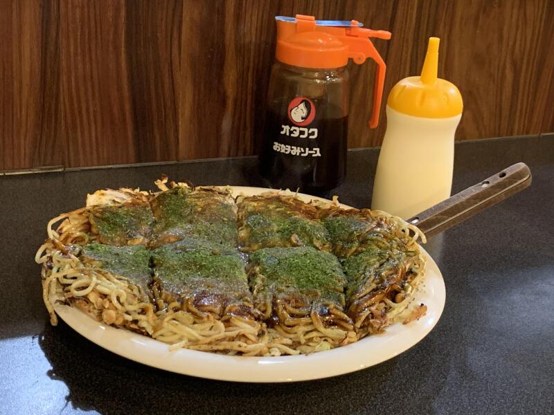 しばらくしてお好み焼が焼きあがる。確かに薬研堀八昌のルックス。お皿だけど、ヘラも出してくれた。崩れにくいのでお皿で食べても違和感はない。広島では鉄板で食べられないお店は珍しいので考えたこともなかったけれど、お皿でもヘラを使うのっていいよね。
