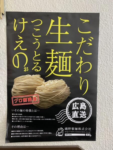 やっとのことでお店の前に到着する。店舗は2階にあるようだ。早速、階段を登っていくと、途中に磯野製麺のポスターを発見。「生麺つこうとるけえのぉ」の文字にこころが躍る。わずかな階段の段差さえももどかしく感じる。そうして、扉を開けて勢いよく店内へと流れ込む。「てっ、鉄板前はいいですか?」むげもなく断られた。残念。
