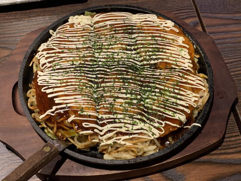 そうしてしばらくして私の元へお好み焼が運ばれてくる。縁ありのモバイル鉄板。なんとマヨネーズがかけられてる。あらかじめ聞いてくれないんだねと少しションボリ。食べてみると、ソースたっぷりにマヨネーズなので味が濃いめ。肝心のいその麺はパリパリ感までは行かないけど、焼きが少し入って硬くなってる箇所もある。うーん、どっちつかずの印象。小麦の風味も立ち上ってこない。いや、そんなレベルの高いところを求める方が間違っているんだ。そうだよ。と自分をなだめながら食べ進む。それでもやっぱりマヨネーズだけはいらないなぁ。