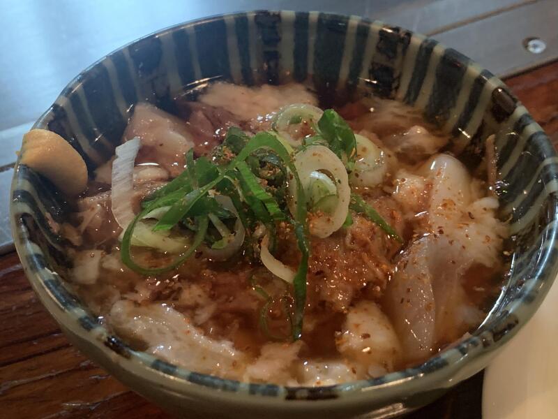 主人は、お好み焼を注文するのが早いか、生地を鉄板に落とすほうが早いかといった素早さでお好み焼を焼きはじめる。すると間も無く牛すじポン酢が運ばれてきた。これは広島でよく見かけるタイプ。広島を謳うお好み焼屋でも、どこか違和感のある牛すじポン酢がであることが多いが、これはまさに広島のお好み焼屋で出してくれるヤツじゃないですか。ついレモンハイを飲むペースが上がる。