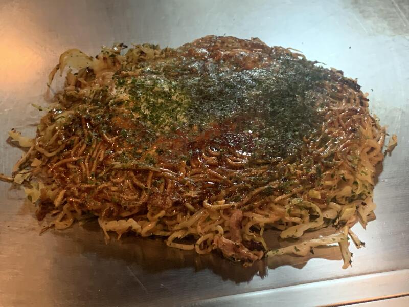 そうやって、牛すじポン酢に心奪われている間も私のお好み焼は焼かれていく。いつの間にか麺を茹で始めている。茹でた麺を手際よく成形し、しっかりと焼きを入れた後、お好み焼本体と合体。最後にソースを塗り、私のもとへと滑らしてくる。おぉ、これはまさしく薬研堀八昌。話によると、元は広島の有名なイタリアンで働いていたが、そこを辞めて、お好み焼の世界へと足を踏み込んだとのこと。薬研堀八昌で数年修業し、自分のお店をオープンさせた。なぜ、東京へと尋ねてみたけど、はぐらかされた。でも、この地でもう10年近くされており、固定客をつかんでいる。ありがたいことです。