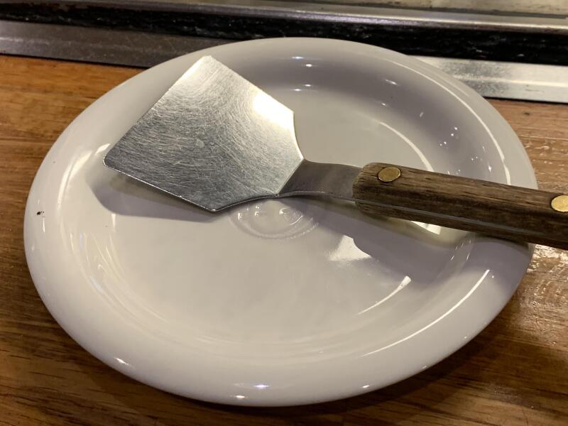 店内は奥に向かって縦長。左側に鉄板カウンターが並び、右側にテーブルが配置されている。開店間もない時間なのに、店内はほぼ満席。かろうじて残っていたカウンターに座らせてもらい、すかさず注文は肉玉そば。小母ちゃんから「うちは大葉が入ってるんですが」はい、心得てますよ、それでお願いします。あと、鉄板で食べたい旨を伝えると、私の座ったカウンターではダメとのこと。待ちますかと聞かれれば、そりゃ待ちますよ。鉄板で食べられるなら何時間だって待ちます。