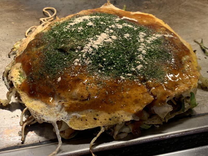 数組のテーブル客に順番を譲り、しばらくしてから私のお好み焼も焼かれ始める。そうして、ちょうど鉄板席が空いたタイミングで私のお好み焼も焼きあがる。こちらへどうぞと空いた席に案内してもらう。